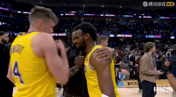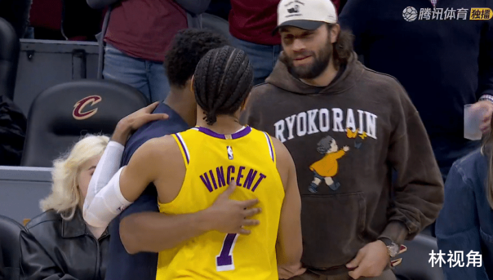 两队没有退场的球员很友好,在场上互相拥抱致意,米切尔和文森特拥抱热聊,本场没有出战的加兰也走入场内,和克内克特拥抱聊了几句,看到布朗尼过来,加兰伸手一把抱住,与其亲切拥抱致意,布朗尼很受欢迎啊。