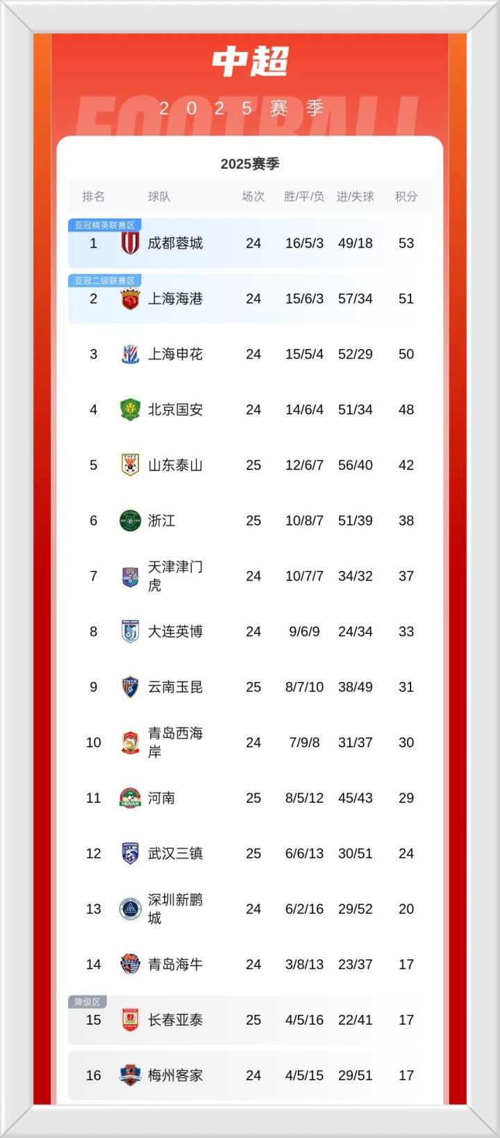 海牛队的1分让其积分来到17分,和长春亚泰队齐平,依靠净胜球优势力压对手,继续排在倒数第三的位置,而亚泰队也依然在降级区深陷其中。