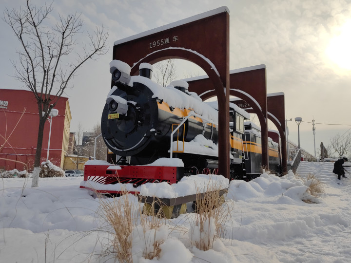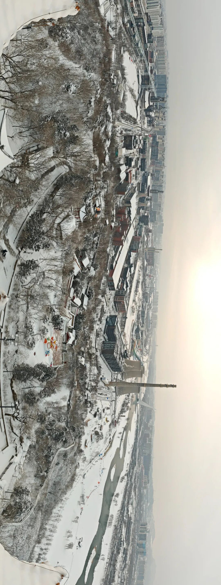 漫步雪后的河畔,享受玩雪的乐趣,石景山功碑阁的雄奇与河畔木屋的静谧相映成趣,织就一幅冷暖交织的冬日美图。