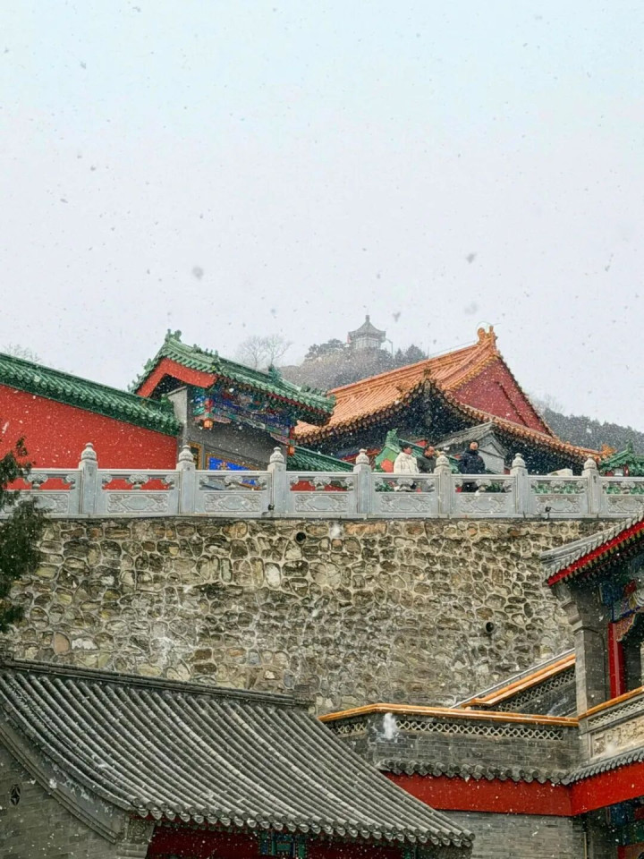 八大处瞬间换上银装,红墙黛瓦被白雪轻裹,苍松翠柏缀满冰晶,登山步道铺着松软积雪,“层峦晴雪”的景致尽显冬日禅意,游人踏着雪迹寻幽赏景,每一步都像是走进了诗意画卷里~