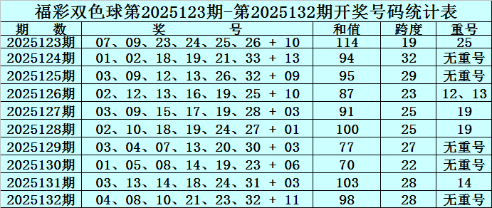 双色球第2025132期奖号开出:04、08、10、21、23、32 + 11,红球号码和值开出98,跨度开出28,开出重号0个:无重号。蓝球为2路号码。