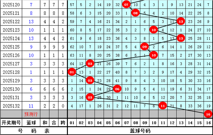 蓝球分析:上期开出蓝球号码11,号码遗漏值为1,温热蓝球号码连续开出之后,本期可以放弃,防冷码蓝球解冻,一码蓝球关注16。
