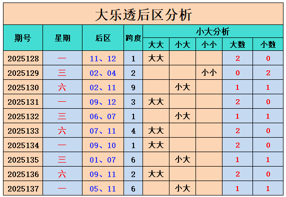 最近10期后区大小比为14:6,最近10期后区大大组合开出5期,小大组合开出4期,小小组合开出1期。上期开出小大组合,本期看好小大组合出现。