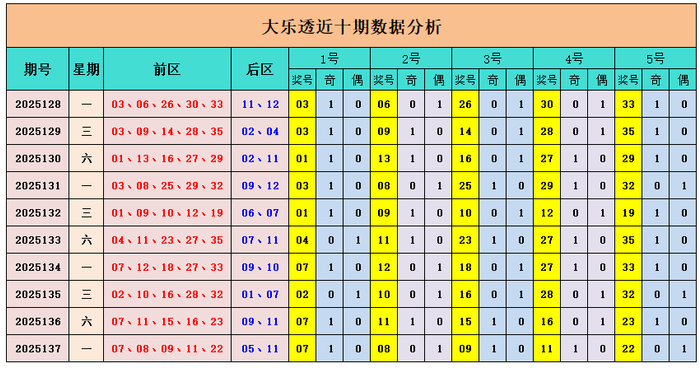 上期回顾:大乐透第2025137期奖号为:前区07、08、09、11、22,后区05、11,前区奖号和值为57,后区开出小大组合05、11