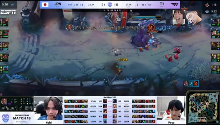 [23:21]上路团战,Keria波比锤飞JPN两人,Yuhi卢锡安穿兵Q带走Oner奇亚娜,hachamecha剑魔砍掉Peyz,JPN打出1换3,经济落后9k。